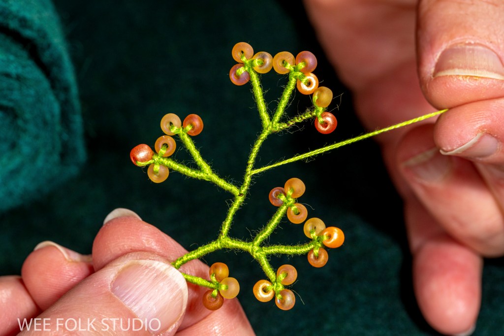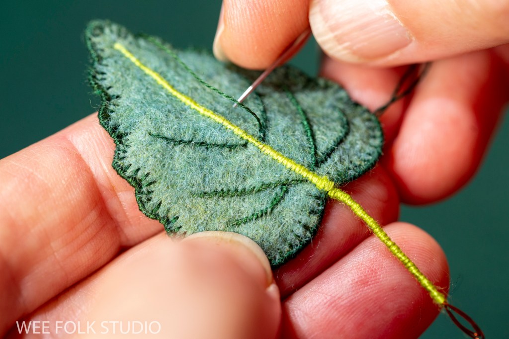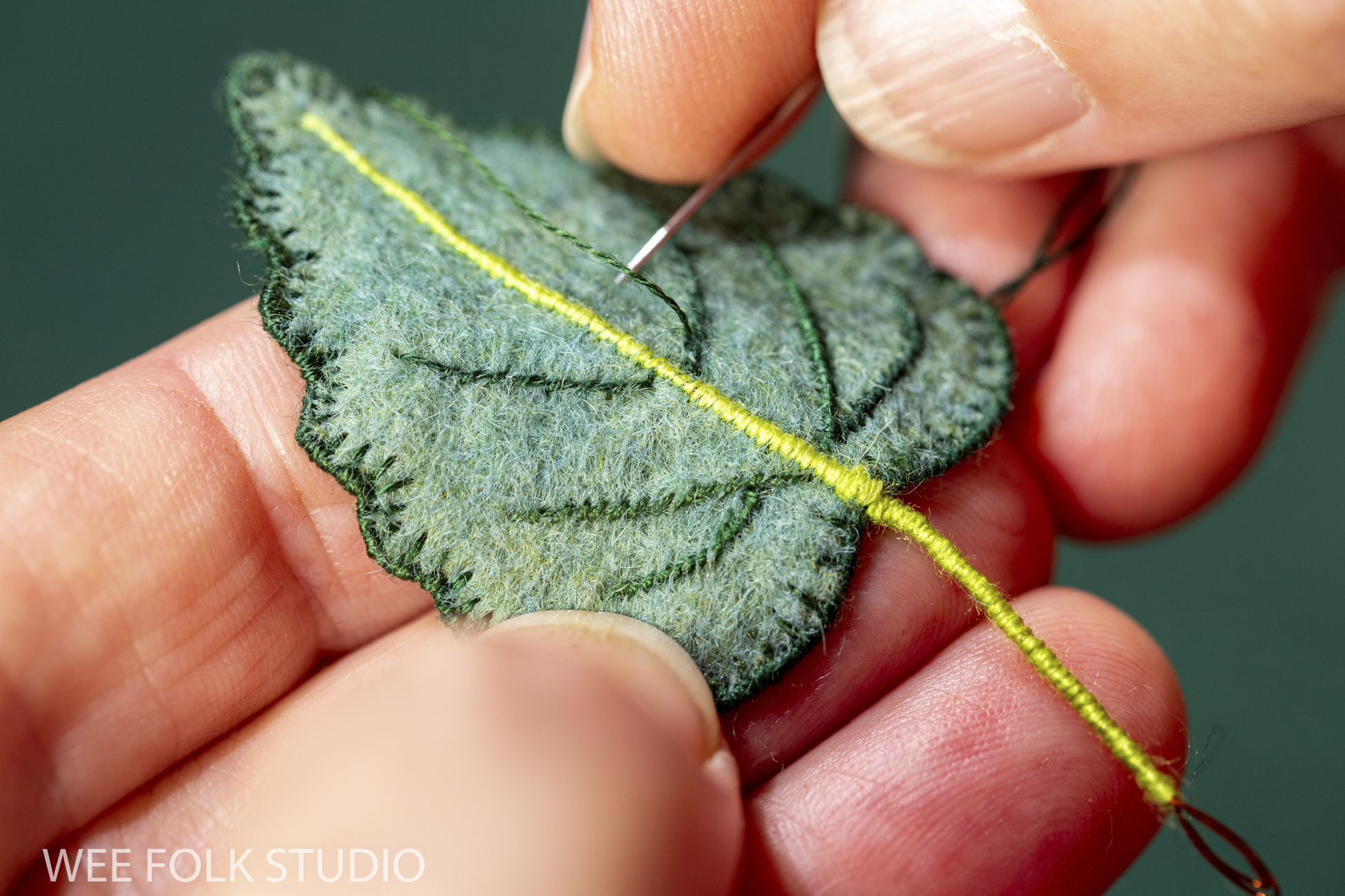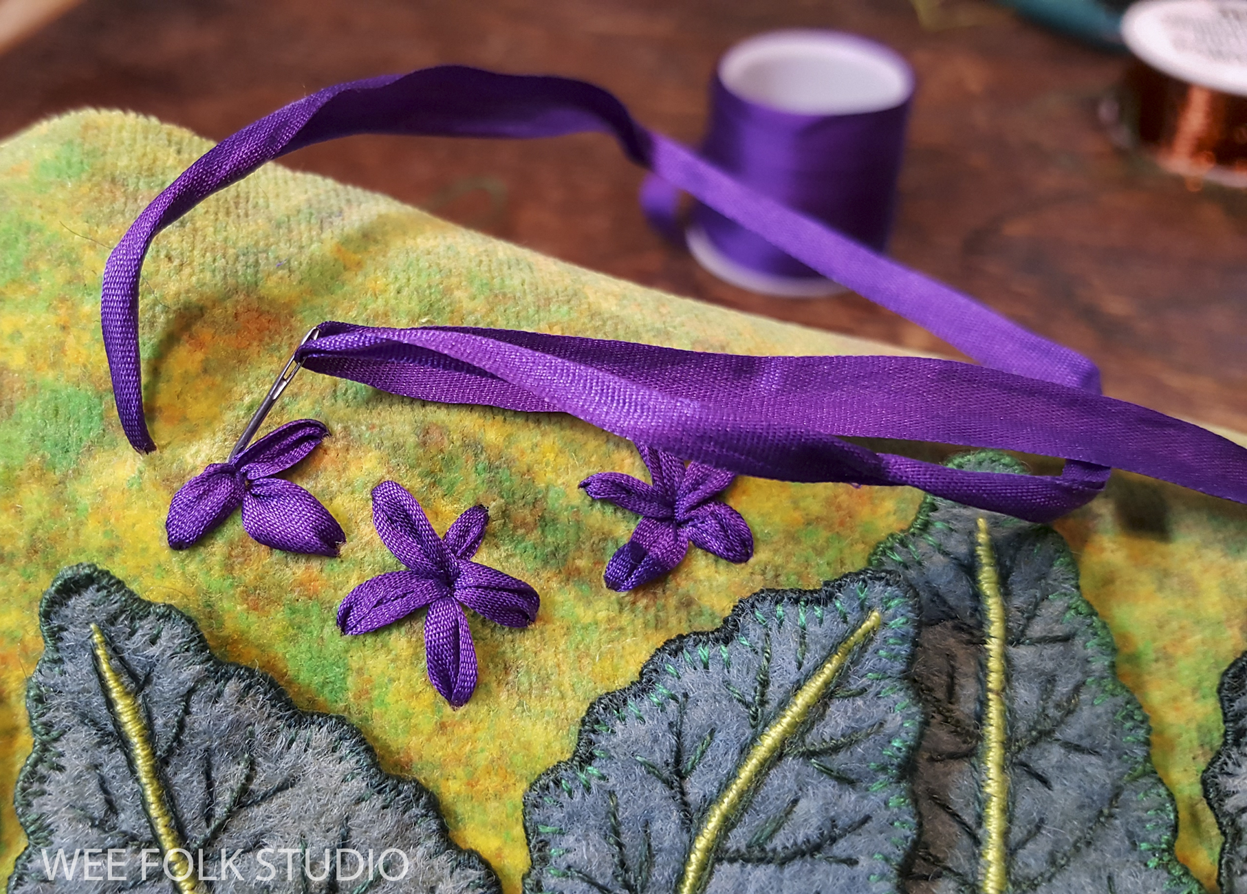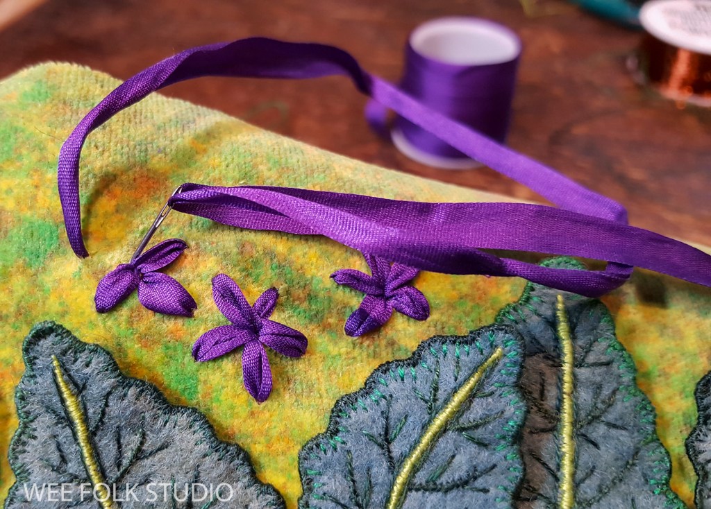 My Self Portrait shows a spiral of dolls, one for each year up to age 52, which was my age in 2007. My birth date is embroidered in the center. Yes, I’ll soon be turning 70! Each figure is dressed in an outfit I would have worn that year, taken from memories, family photos or my imagination. The figures range from 1 in. to 3 1/2 in. and are variations of the wee folk dolls in my how-to book, Felt Wee Folk.