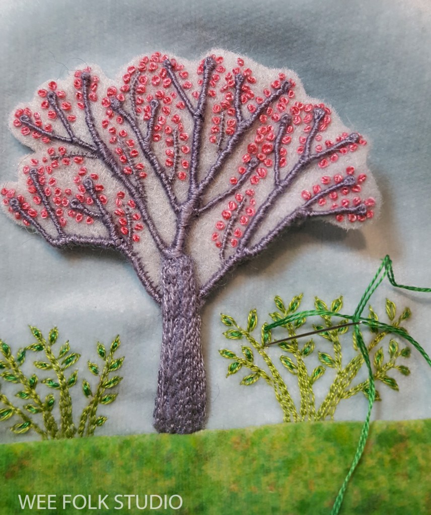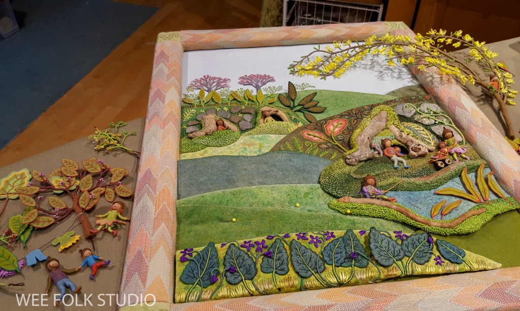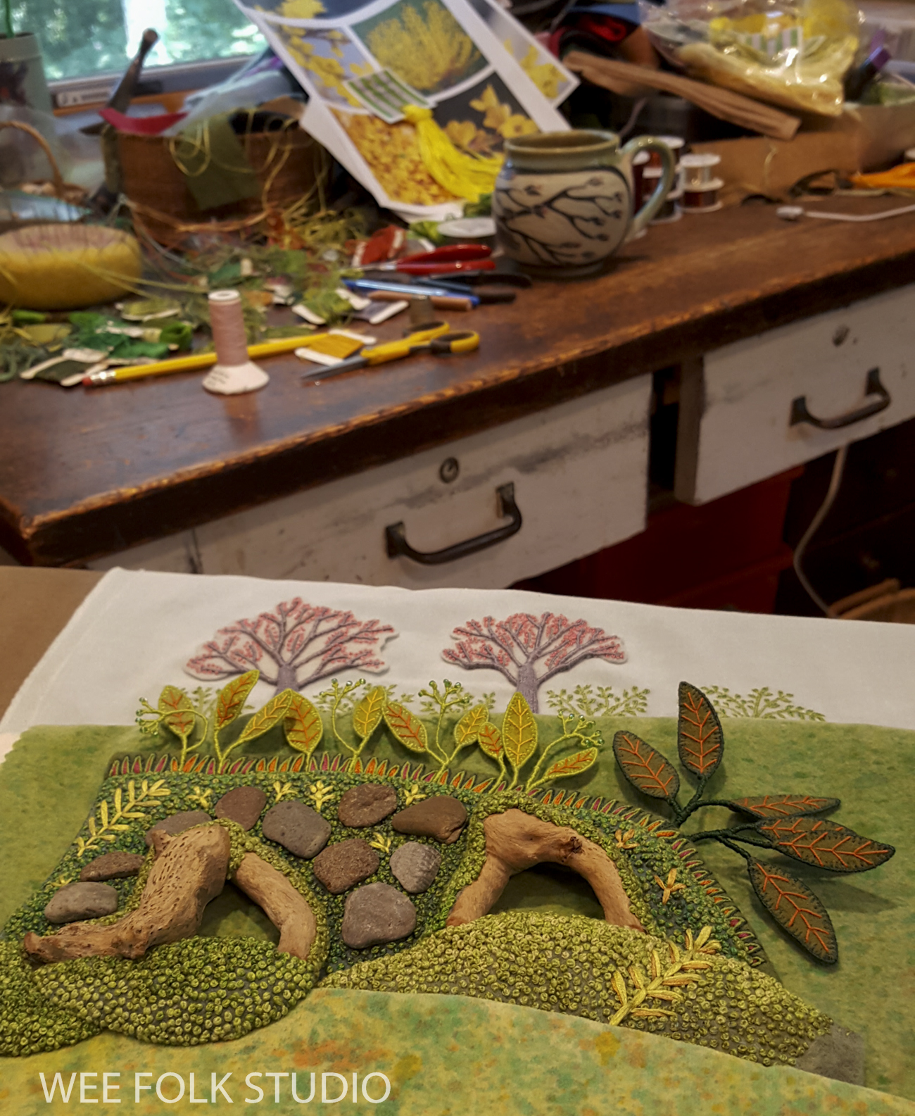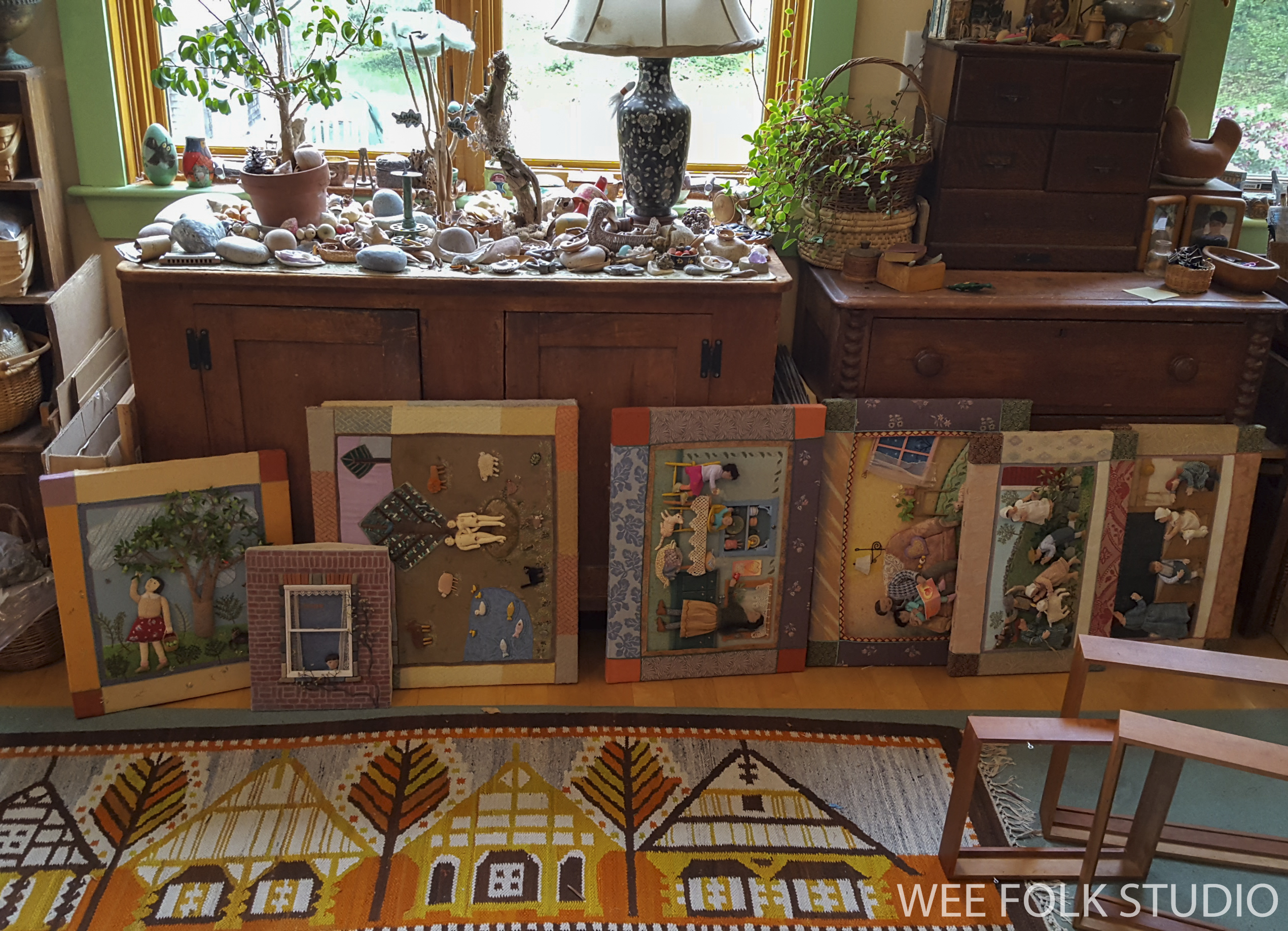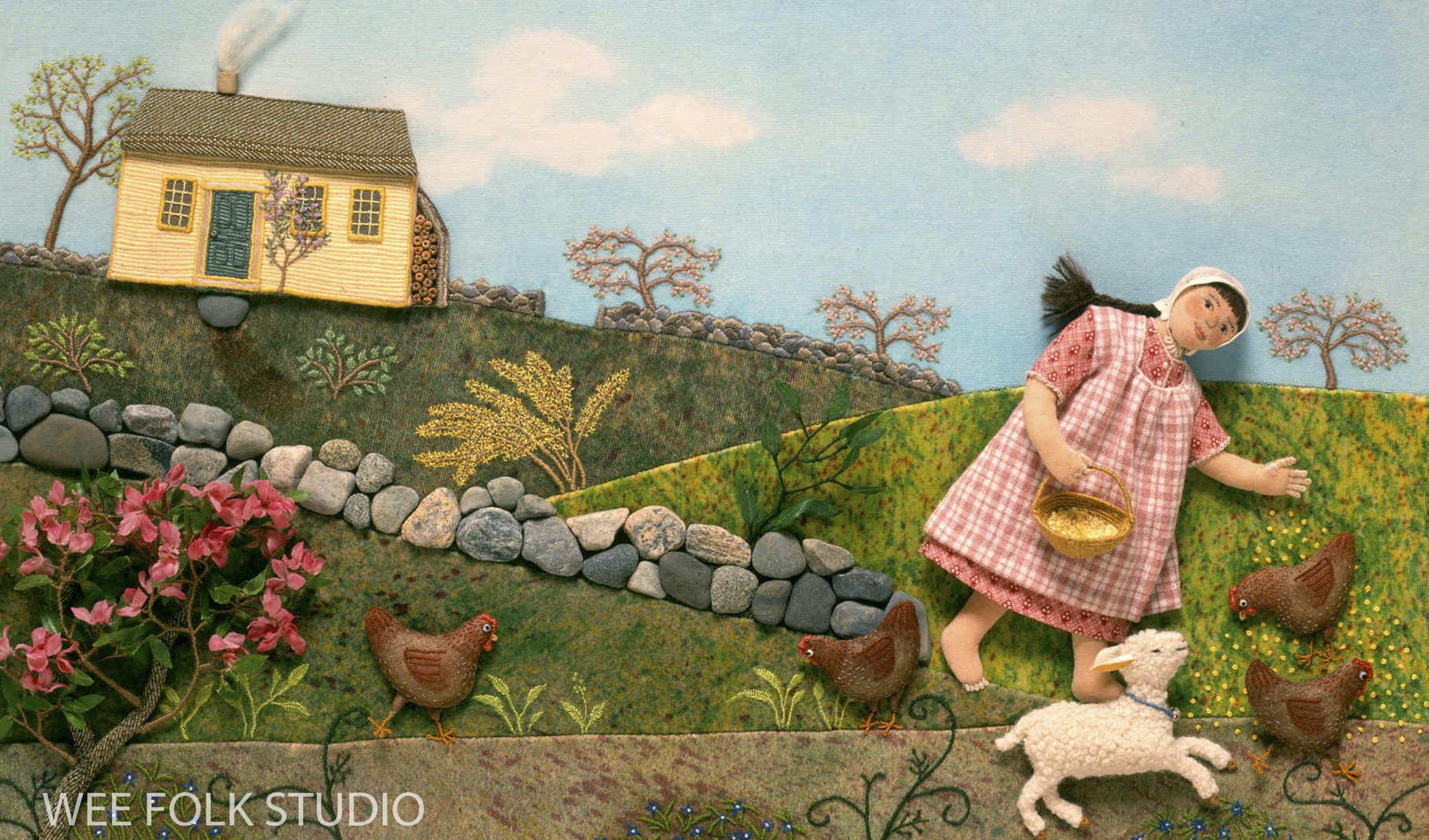 A woman wrote to tell me that 3 generations of her family enjoyed seeing my work at a recent exhibition. She especially wanted me to know that her 4 year old granddaughter was so taken with my self portrait that they couldn’t tear her away. For little Emma, the progression of dolls opened up the concept of growing up and visualized the passage of time in a simple, direct way. I love hearing accounts like this, because it reaffirms my intention to make art for all ages, whether it’s book illustration or stand alone embroidered pieces like this one.