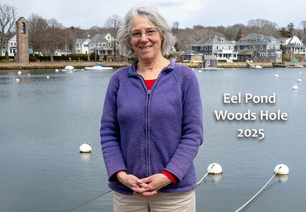 The following 2 photos of me with Eel Pond in the background, one taken in 1960 and the other in 2025, are hung on the wall next to the Self Portrait.