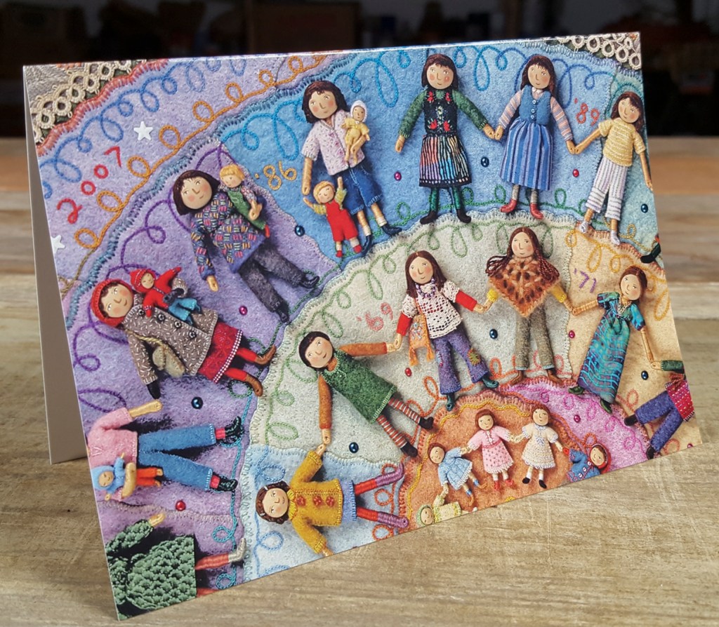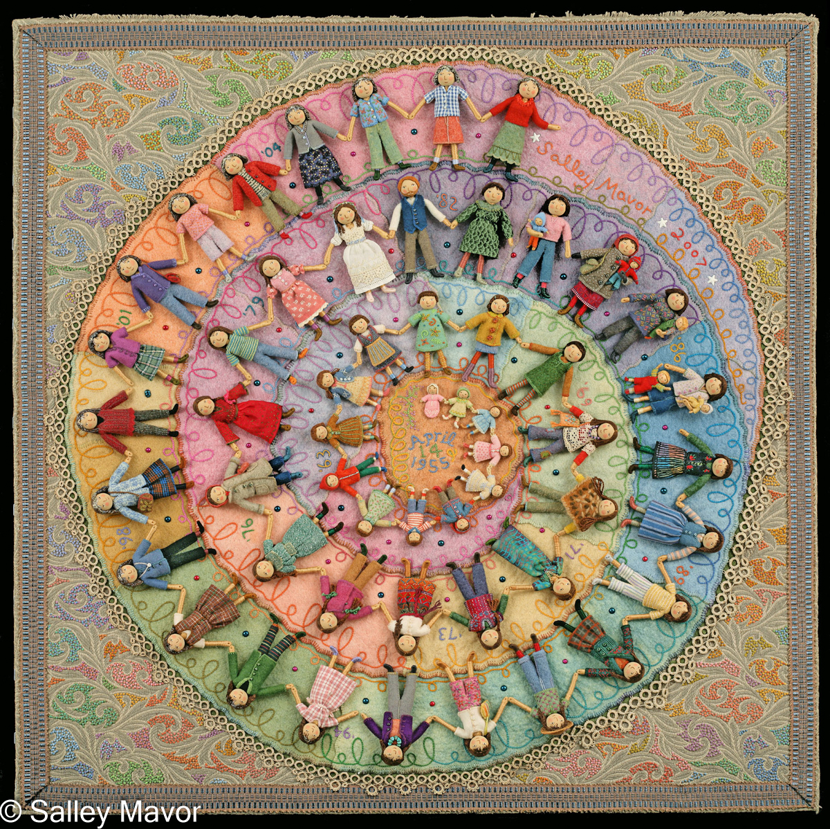 Since I made many of my own clothes, I remember the fabrics and clothing styles. They are recreated here with smaller scale fabric and embroidered wool felt. My husband, Rob, appears the year we were married and my sons, Peter and Ian, are included through the years when they were little and physically connected to me. The tatting around the outside of the circle was made over 100 years ago by my grandmother. This piece resonates with a lot of people whose lives parallel the same time period. I can’t tell you how many women remark that they had an alpaca poncho, too!