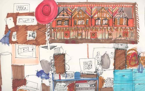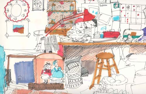 I was saving the book jacket illustration for last and imagined how it would look while I stitched the other pages. I took a mental inventory of what materials would be needed and was shocked to discover I’d forgotten about the sky fabric. I had used every last inch of Peter’s overalls on the inside artwork. I had none left for the cover illustration, the most important of all! This was a drawback of working with unconventional materials. If I worked in watercolor, this would never happen!