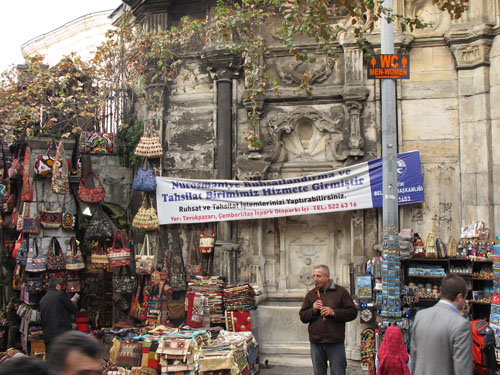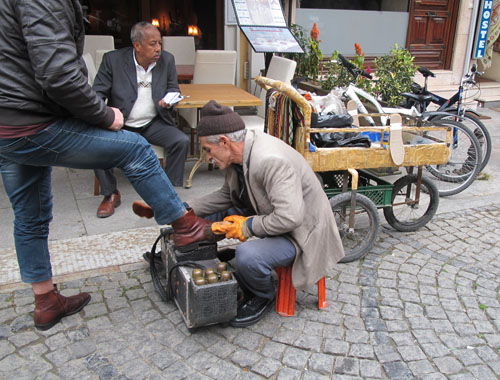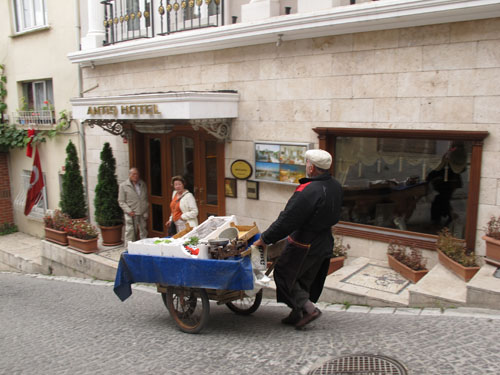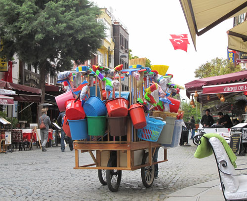 We’re home from Turkey, still jet lagged and dazed by our experience. From now on, when hearing about Turkey on the news, I will picture the amazing sights, remember the taste of the delicious food and think of the friendly and playful people. I’m going through the hundreds of photos from the trip and will be posting them according to subject matter. Everywhere, there were vendors, from the streets of Istanbul to a remote rocky island with no habitation in sight. The first picture shows what looks to be a real live gnome sitting on a plastic chair. He was selling honey and jewelry on a desolate cove where we spent the night in our boat. We followed the sign to the restaurant, but found it closed for the season. The other pictures were taken in Istanbul, which throbs with commerce.