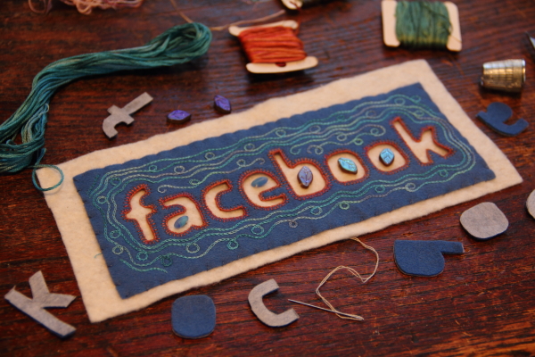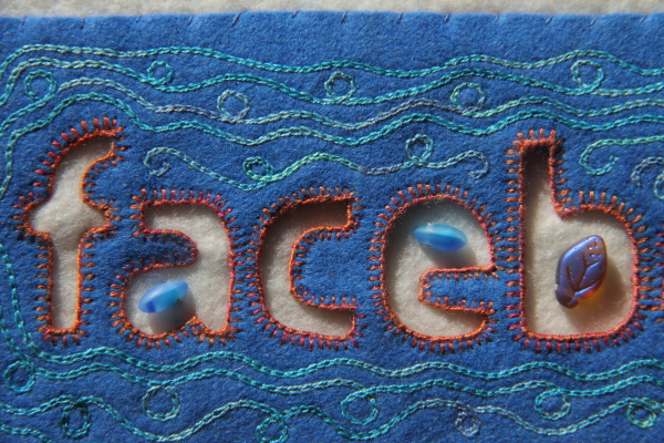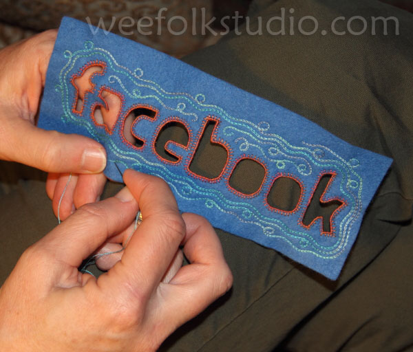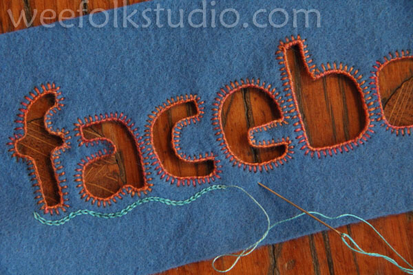 I enlarged and traced the Facebook logo and cut out the letters with a blade. It’s difficult to write on felt, so I turned it over, so that the letters were backwards and traced the letters on a piece of fusible interfacing. I fused the interfacing to a piece of blue felt. Then, I cut out the letter shapes with scissors and sewed a blanket-stitch around the edges.