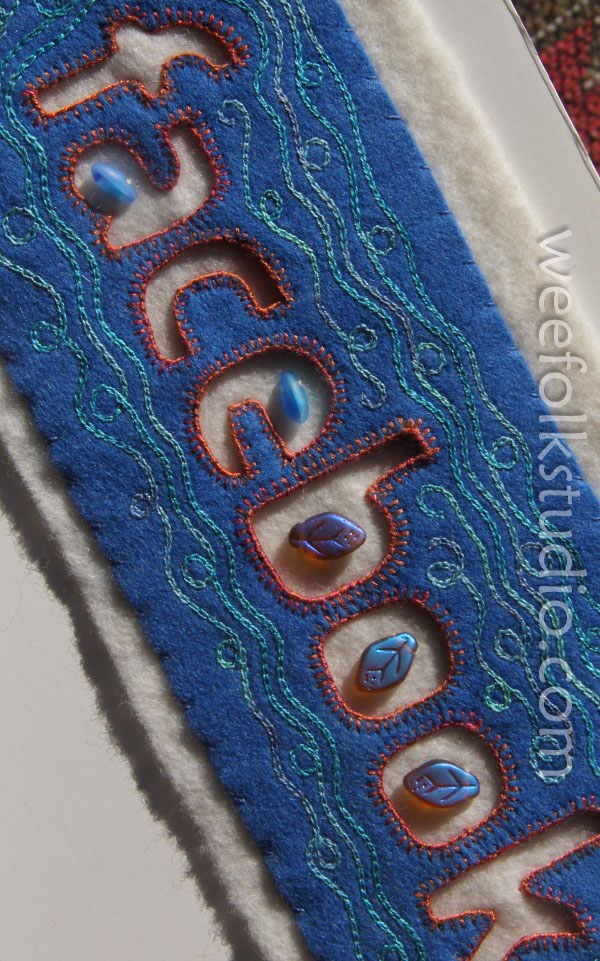 After all of the letters were cut out and stitched, I started making a wavy chain-stitched pattern around the word.