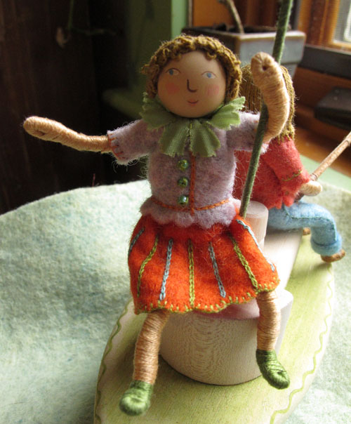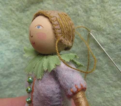 To make Louisa’s hair, I stitched embroidery floss onto the felt “wig”, which I’d previously glued onto her wooden bead head (see photo above). I should mention that at this point, her head is not yet glued onto the neck. That came at the end, after her clothing was finished. I popped her head on and off throughout the process to check how it looked.
