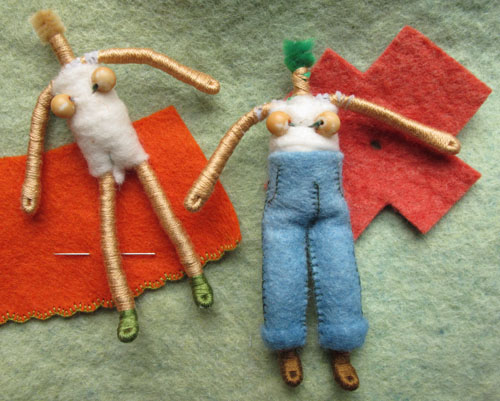 After forming the bride’s limbs with pipe cleaners and wrapping the arms and legs with embroidery floss, I sewed felt around the torso and stitched on boob beads.