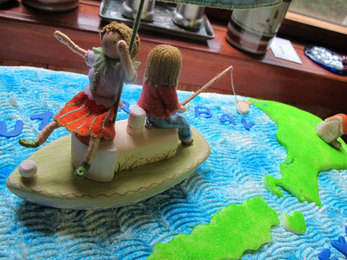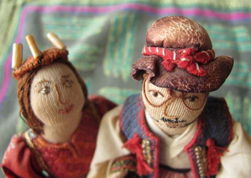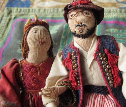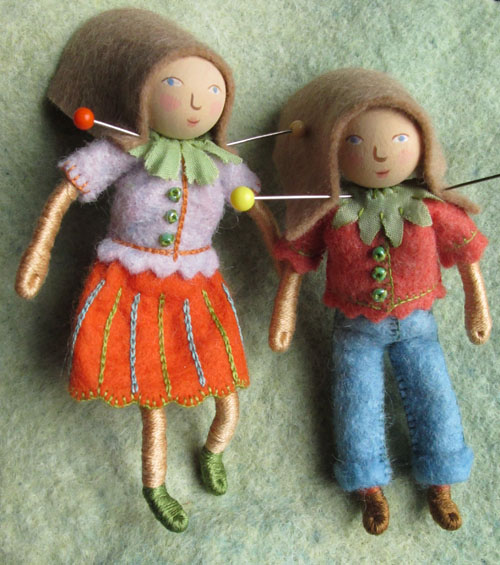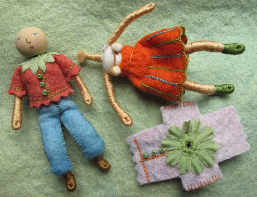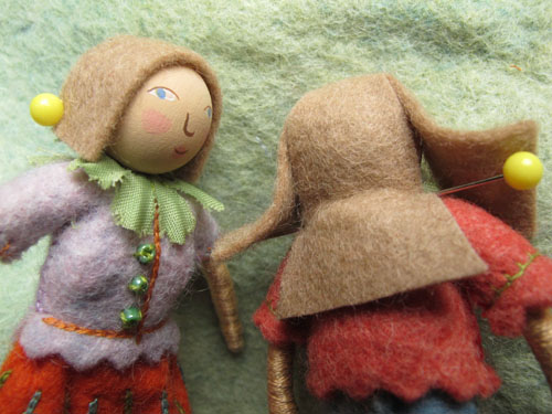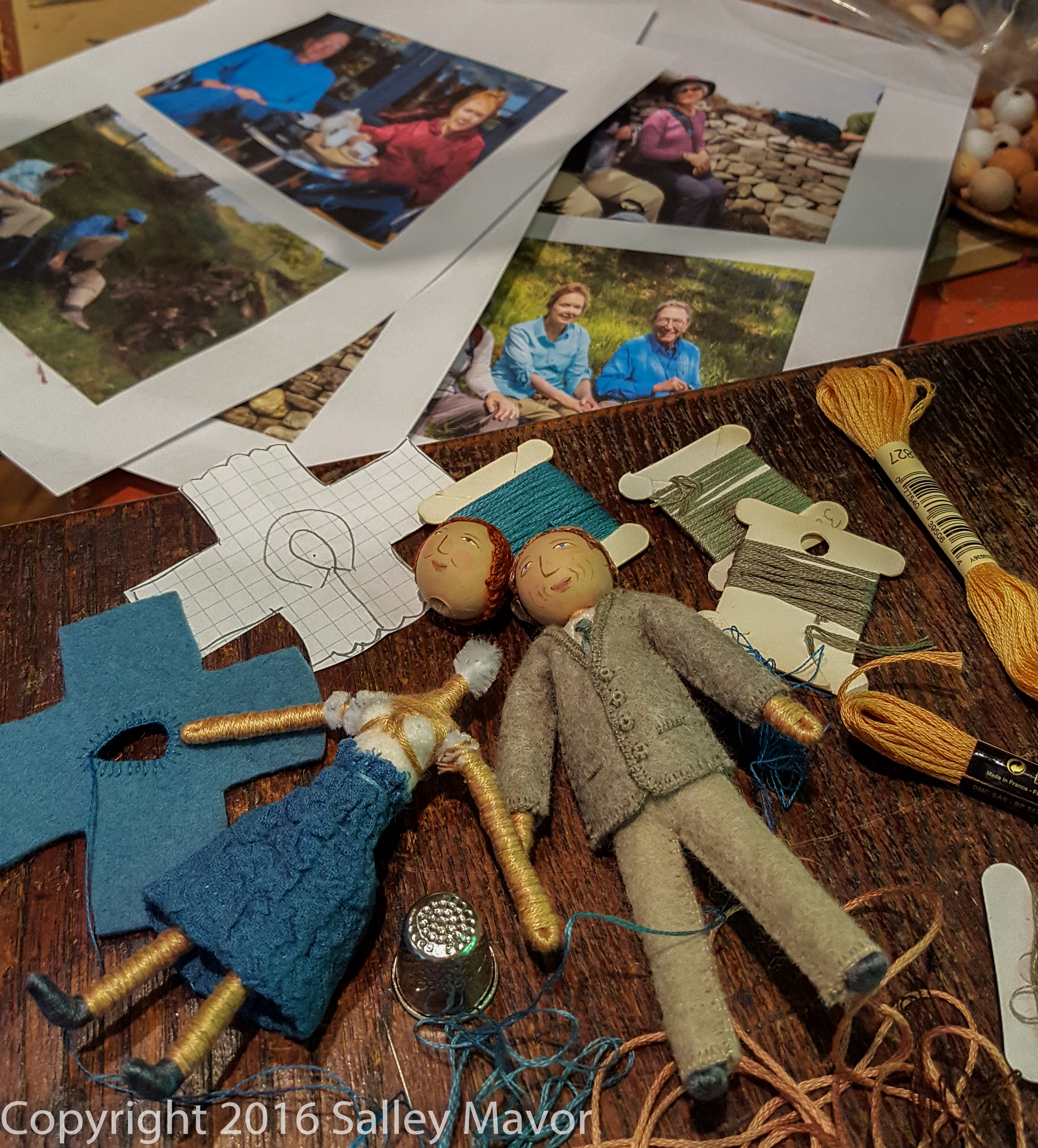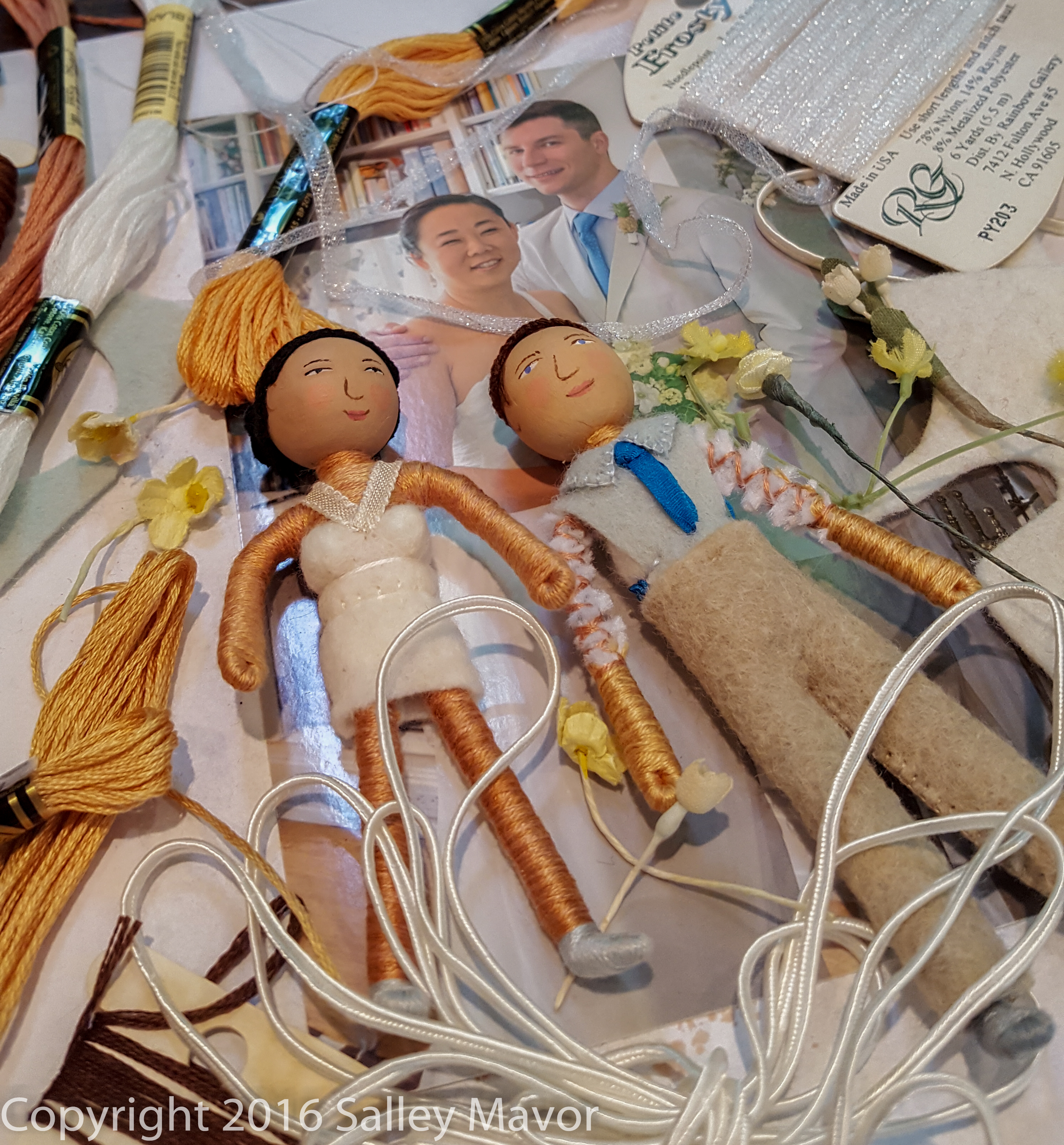 A few weeks before the wedding, Sam and Louisa sent photos of their wedding attire and accessories, including their shoes. As I teach in my how-to book, Felt Wee Folk, the figures are constructed from the feet upward.