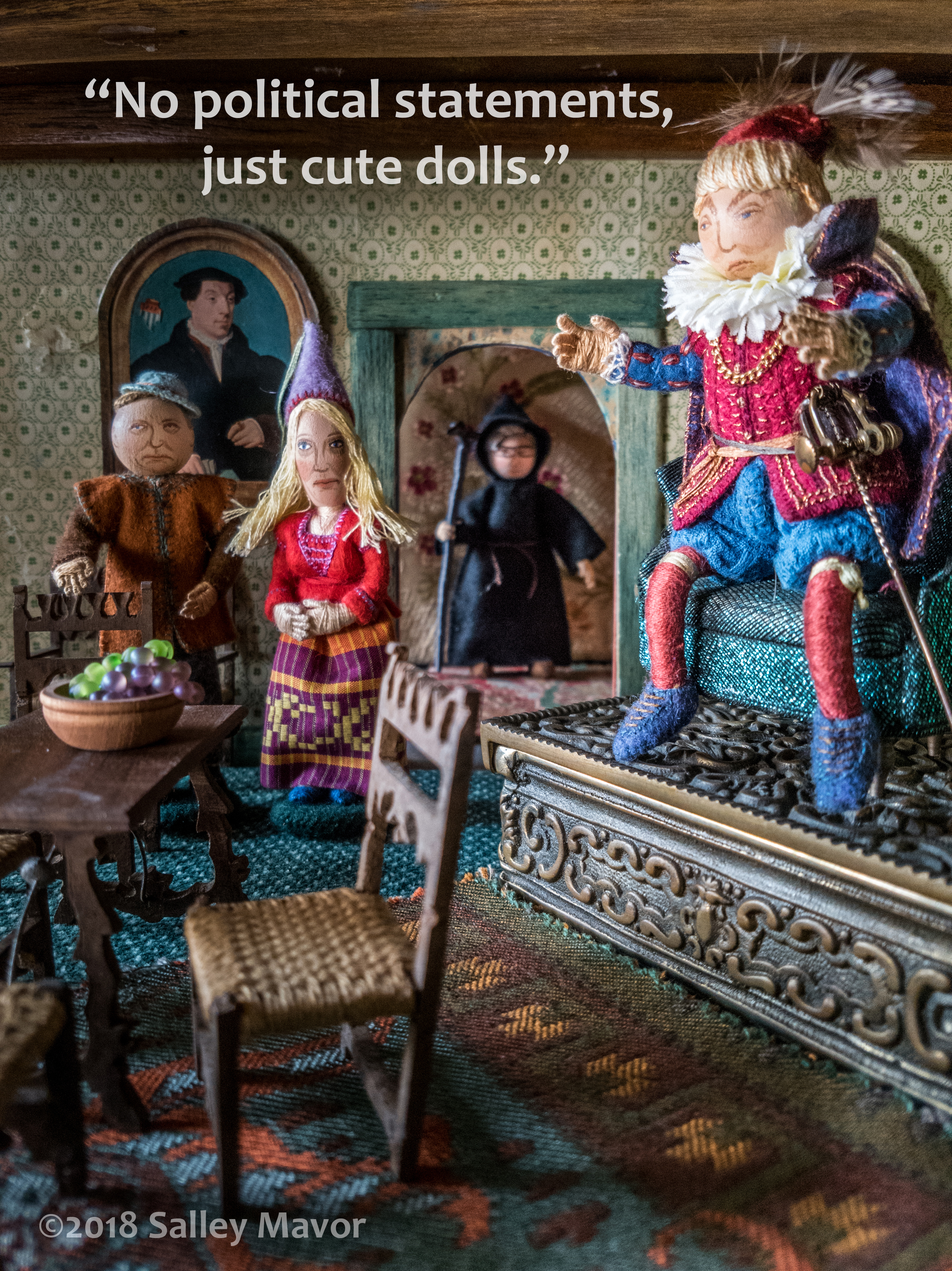 My exhibit was to demonstrate how a contemporary artist uses fiber art techniques to make a statement about today’s world. The new direction of my work leaves behind the cute idyllic and safe fairy world and jumps head on into political territory. The dolls are a metaphor for playing house in a controlled environment, one that has been taken over by outside political forces. For me, the work is about stepping away from a safe, sheltered existence and into a very real reality, one where there is possibility for action toward making a difference in the world. You could call this new direction “sweet resistance art”, since it delivers a strong message in a pretty package, one that is not in your face, even though it does have a tough meaning. My new work has been described as witty, ironic, sophisticated and adorable but chilling. It is a thoughtful critique of the current administration in Washington, with every detail chosen for a reason, and all based on actual things said or done. I don’t expect everyone to agree with my point of view, although many find my artwork refreshing and full of comic relief. To remove the political part would be like taking the stuffing out of the dolls, leaving limp characters of very little consequence and nothing important to say.