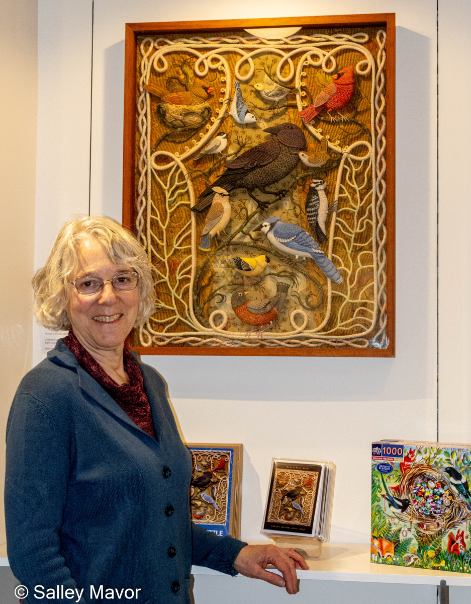 Four scenes, depicting winter, spring, summer and fall, are reassembled and on view in display cases in my exhibition, To Every Season: Works by Salley Mavor. In addition to the dioramas, a wide selection of embroidered pieces that celebrate the wonder and magic of the natural world can be seen, including framed tableaus on loan from private collections and original picture book illustrations from the past 40 years. The show will be on view through Dec. 31, 2025 at the New England Quilt Museum in Lowell, MA. I will be giving an Artist Talk on Sat., Nov. 1, 2025 at 1:00 PM (pre-register here).
