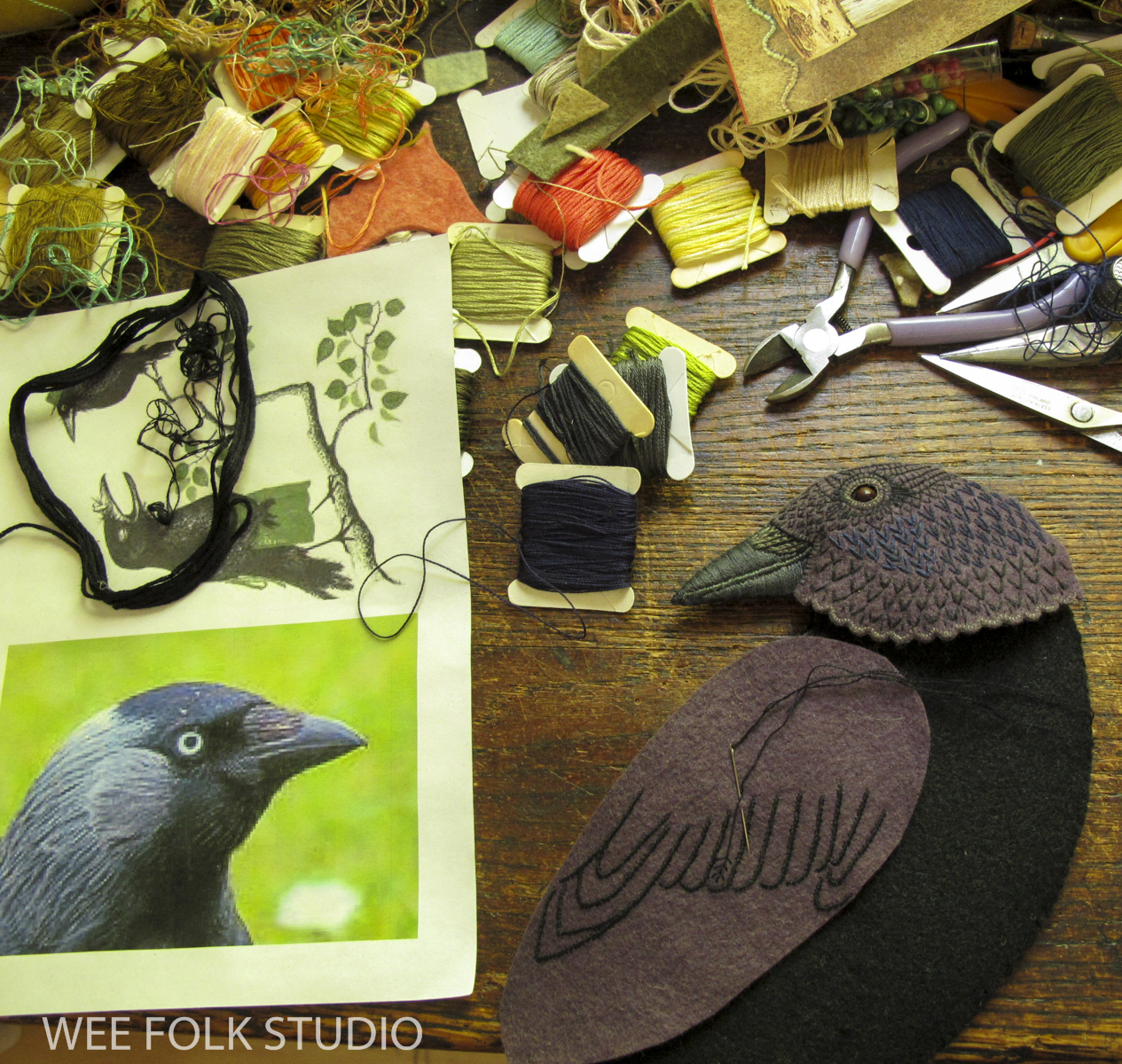Many of the 80 wee folk characters are sample projects from my how-to book, Felt Wee Folk: New Adventures. In addition to providing patterns and instructions for making the figures, the book explains how to make the weighted doll stands you see here.